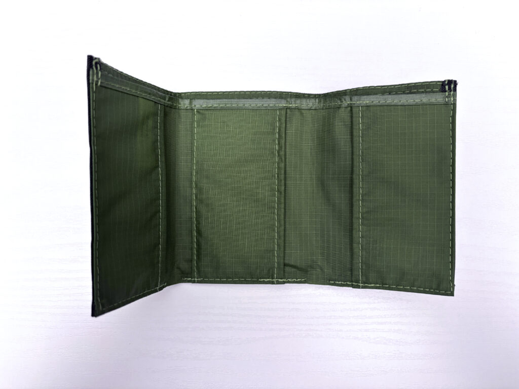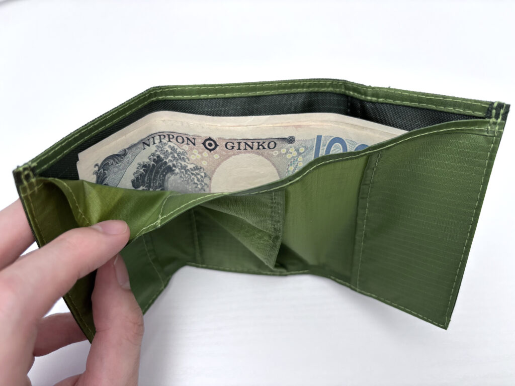 三つ折りを開くと少し明るめの緑色が見えて、カード入れとお札入れにアクセスできる。ジップやボタンはなし。