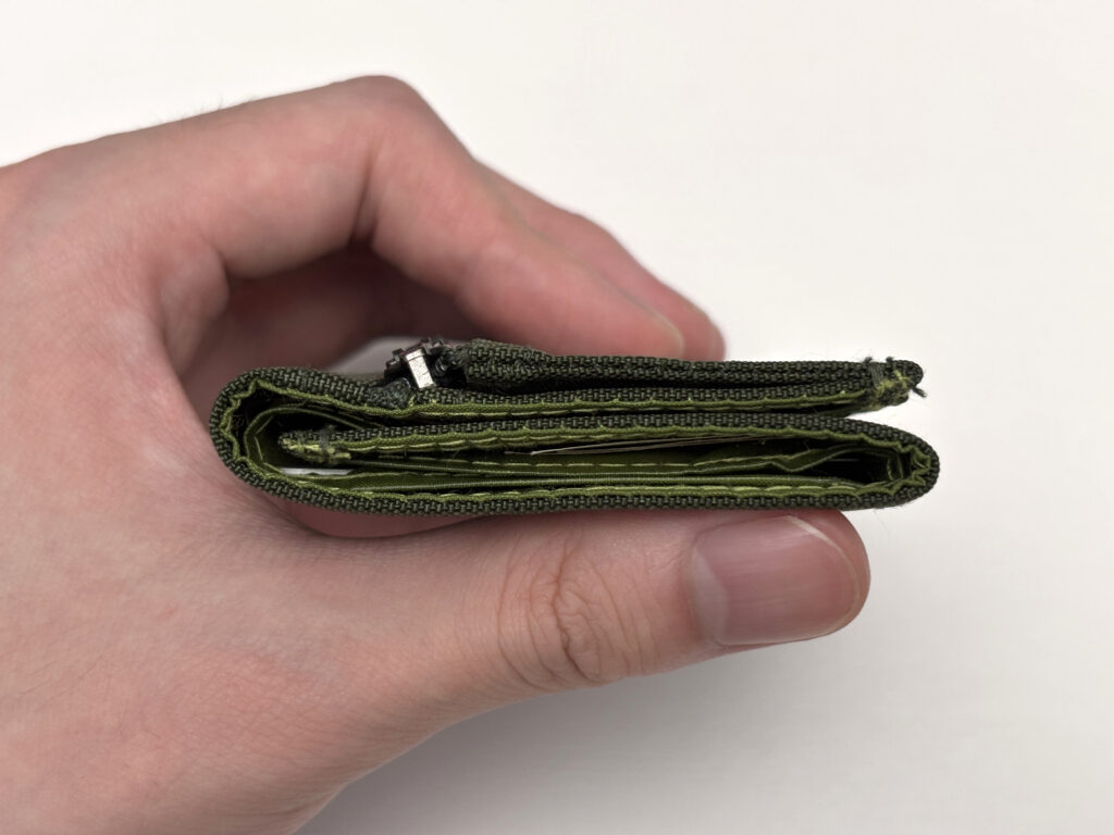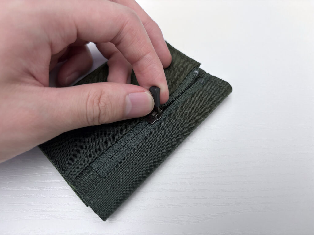 小銭入れの配置も良い。折り目の頂点から若干下の部分にジップが取り付けられていて、横から見ると折り目、ジップ、小銭ポケットとそれぞれ厚みができる部分がフラットに近くなるよう配置されているのが分かる。しかも小銭ポケットは三つ折りにした時財布の最も薄い部分が来るから、小銭を多く入れても膨らみは最小限に収まる。