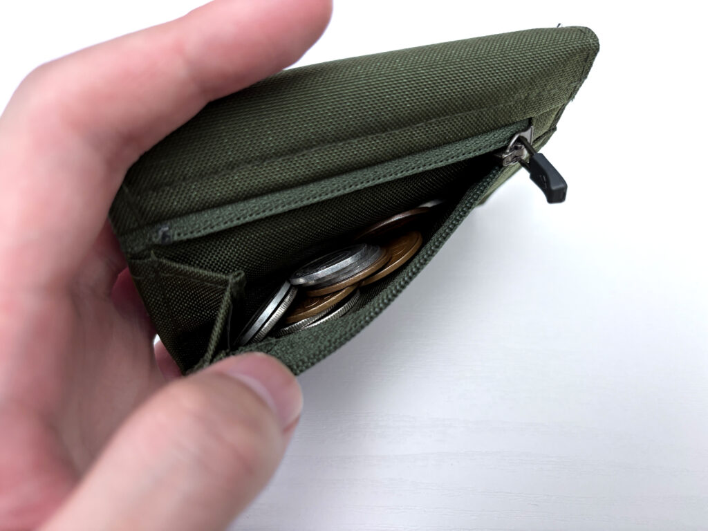まず収納は見た目以上に大容量で、15~20枚程度なら余裕で入ってしまう。開くと片側に大きなマチがあって、小銭の確認と取り出しがしやすい。