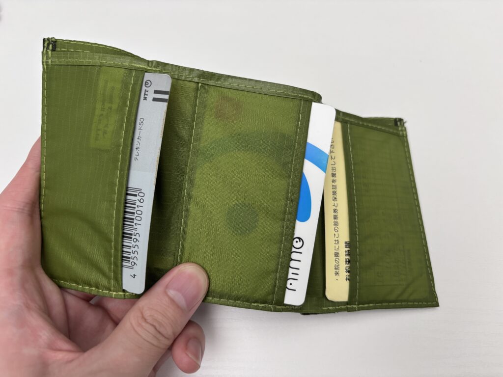 中央のポケットには固い素材のカードを入れるのがおすすめ。トレールワレットには芯材が入っていないから固いカードが無いと小銭の重みでふにゃふにゃしてしまう。通常使用ならカードは入れるだろうからここは特に欠点にはならないと思う。コンパクトさを重視した財布だから、むしろ芯材を入れて厚みが出るより全然良い。