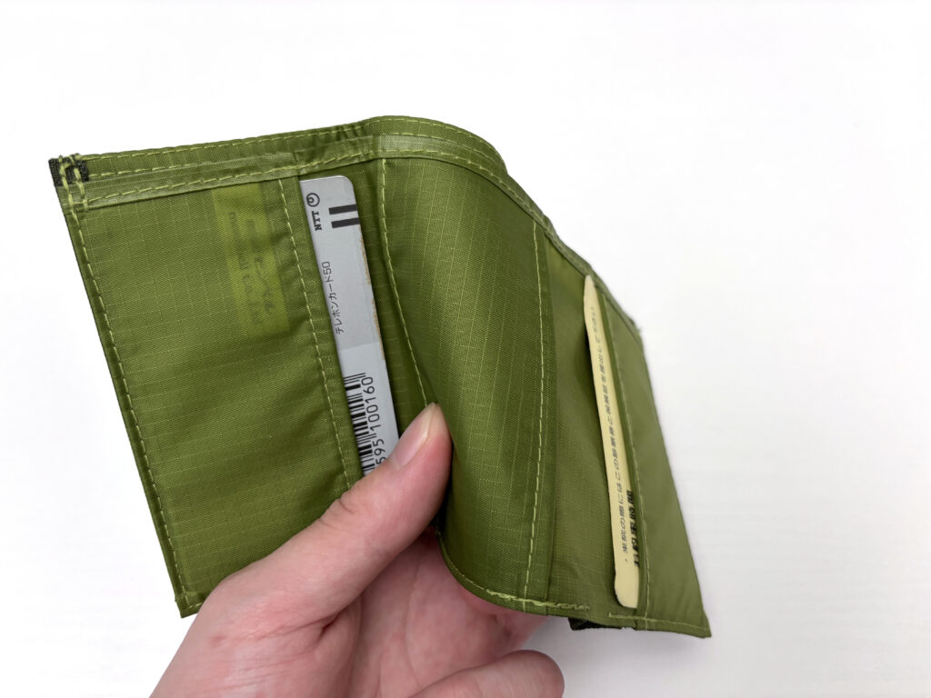 2箇所に軽い折りグセがつくけど、折り目自体は付かないし曲がり具合もセルフレジでエラーなく通る程度。まずここでGU財布の不満点が解消されて筆者は満足。