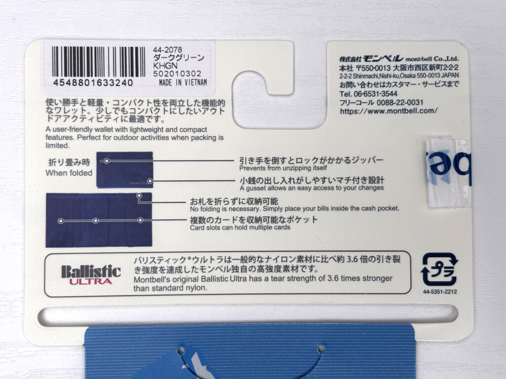 そのうちの1つが今回紹介するmont-bellのトレールワレットで、候補の中で最もGU財布に近いスペックだったのと、店舗で実物を触ってみた感触が購入の決め手になった。